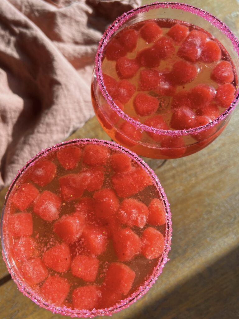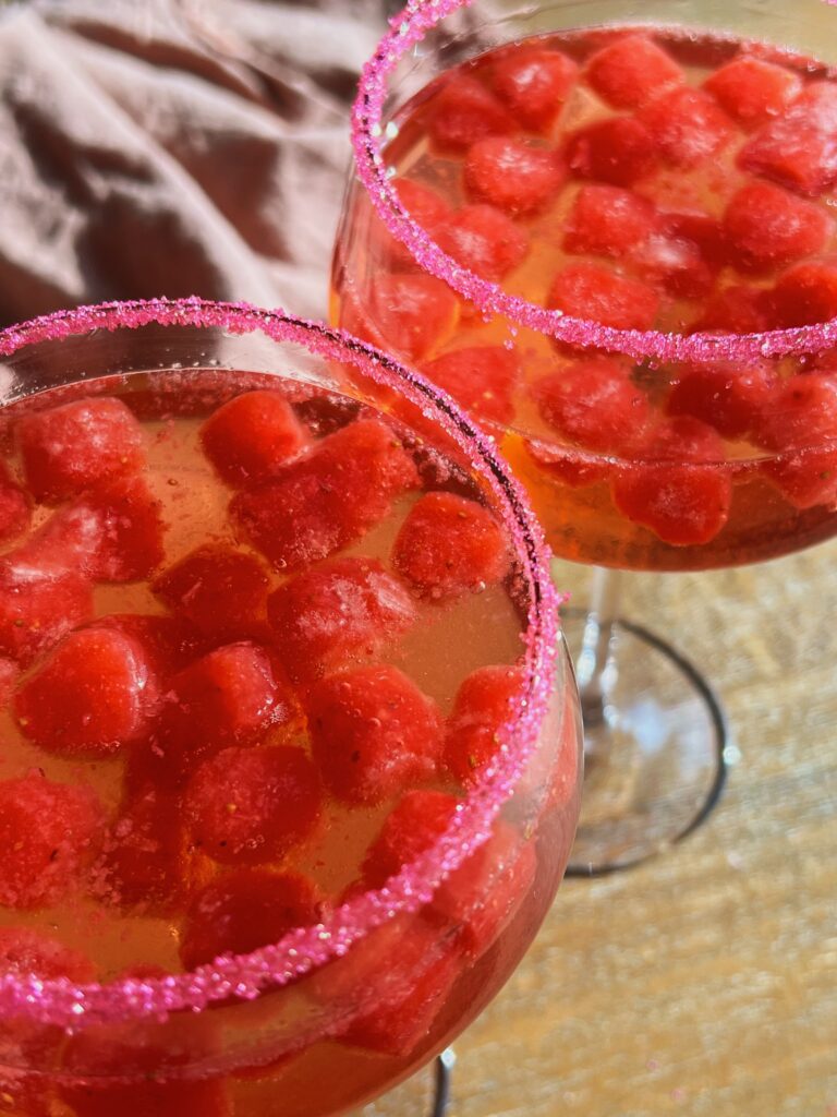 2. Rim your glass with lemon juice & pink sugar. Fill with strawberry ice cubes & your drink of choice & ENJOY!