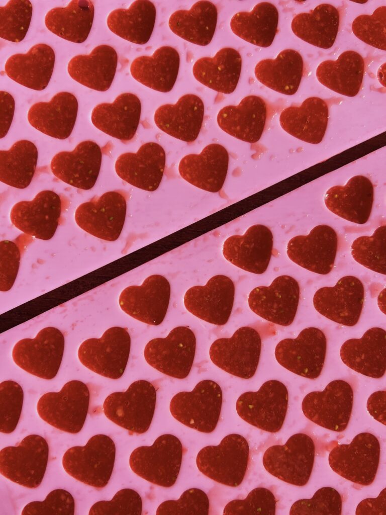 1. In a food processor or high speed blender, blend strawberries, lemon juice and sugar until pureed. Pour into heart shaped silicone ice cube molds and freeze for at least 3-4 hours